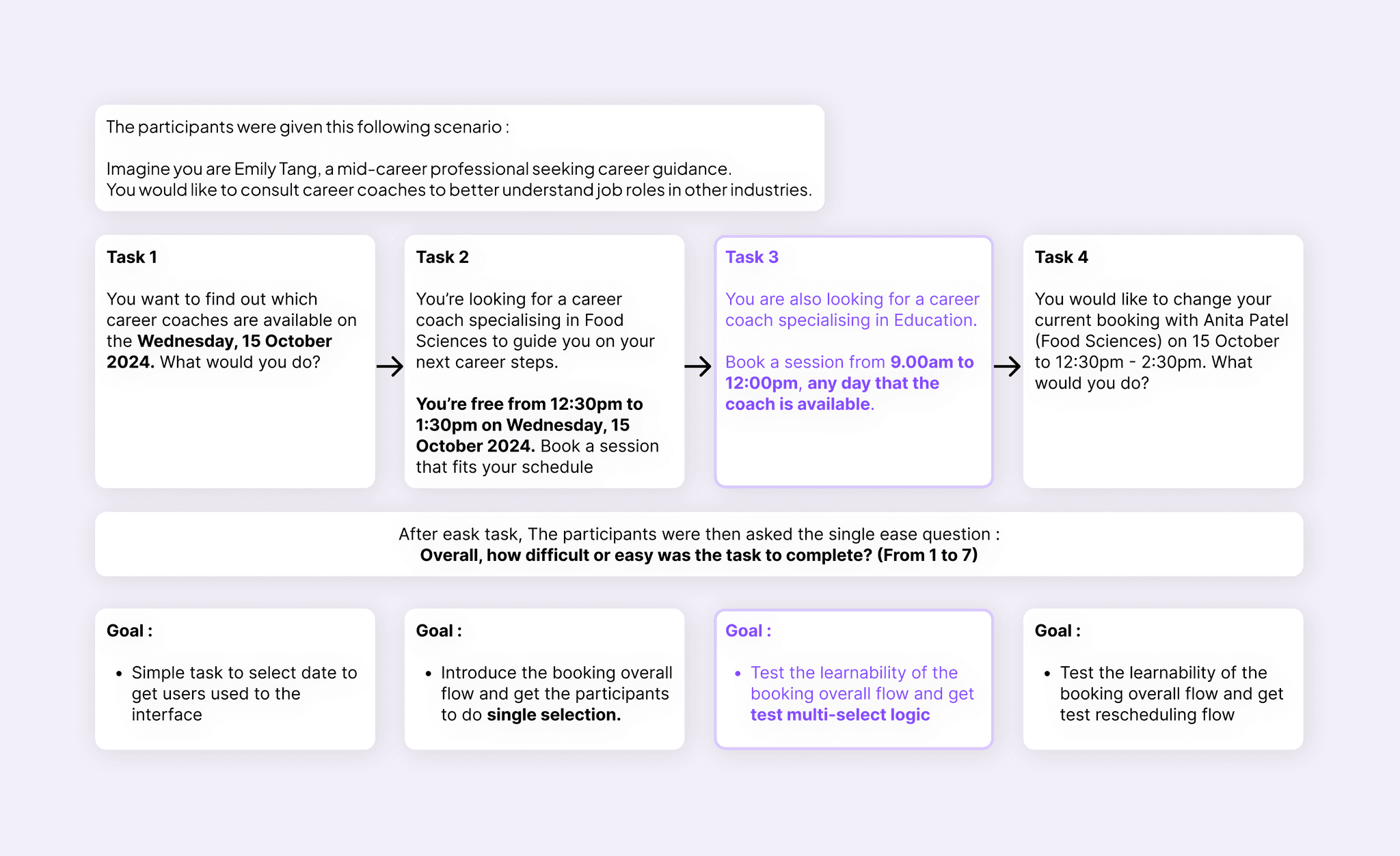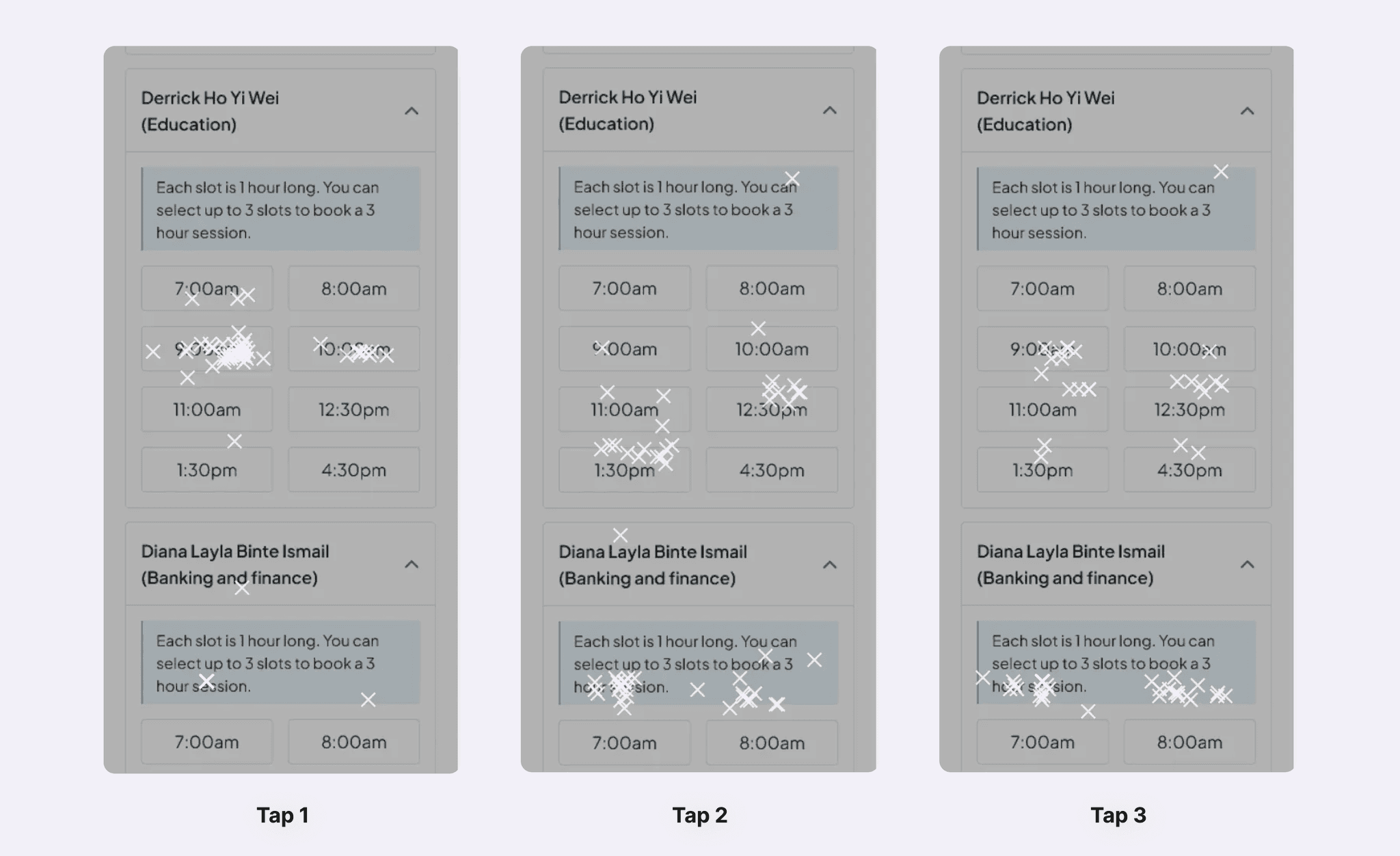 One of the insights that I was recommended to look into during the analysis was the click/tap order in the design. I learnt that the 1st or the 2nd click/tap usually give the insight on the intuition of the user and it highlighted certain key usability issues such as affordances of certain design elements.